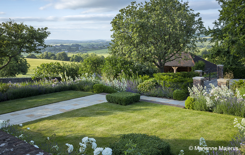 Stone path across lawn, Rosa ‘Iceberg’, clipped Buxus sempervirens cubes in lawn, Centranthus ruber ‘Albus’, Lavandula angustifolia ‘Hidcote’ border edging