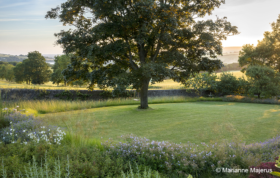 Geranium pratense ‘Mrs Kendall Clark’, sycamore tree in lawn, Stipa gigantea