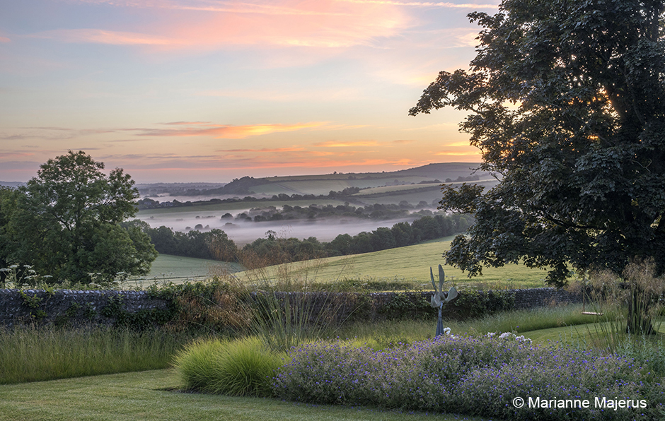 Stipa gigantea, Sesleria autumnalis, Geranium ‘Brookside’, view towards mist in valley, sculpture by David Watkinson