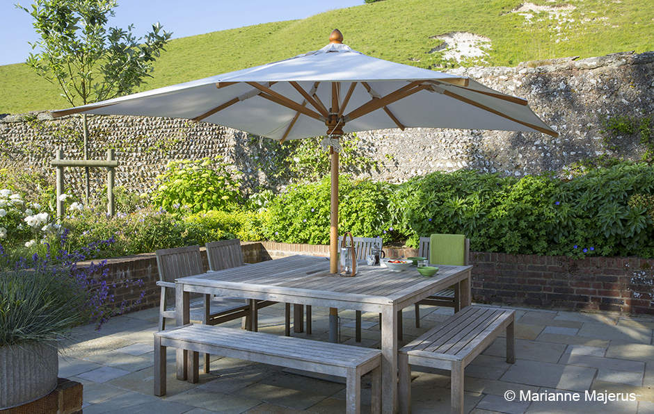 Wooden table and chairs under umbrella on stone patio, brick raised beds, flint wall, Hydrangea arborescens ‘Annabelle’, Geranium ‘Rozanne’, Helleborus argutifolius, Sorbus aria ‘Lutescens’