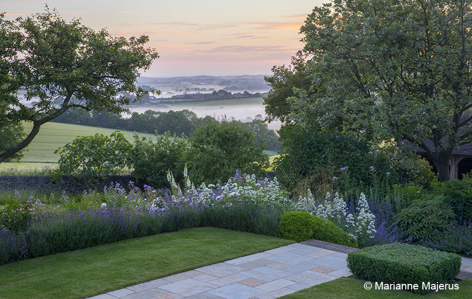 Stone path across lawn, Digitalis purpurea f. albiflora, Centranthus ruber ‘Albus’, Lavandula angustifolia ‘Hidcote’, Nepeta racemosa ‘Walker’s Low’, Rosa ‘Penelope’