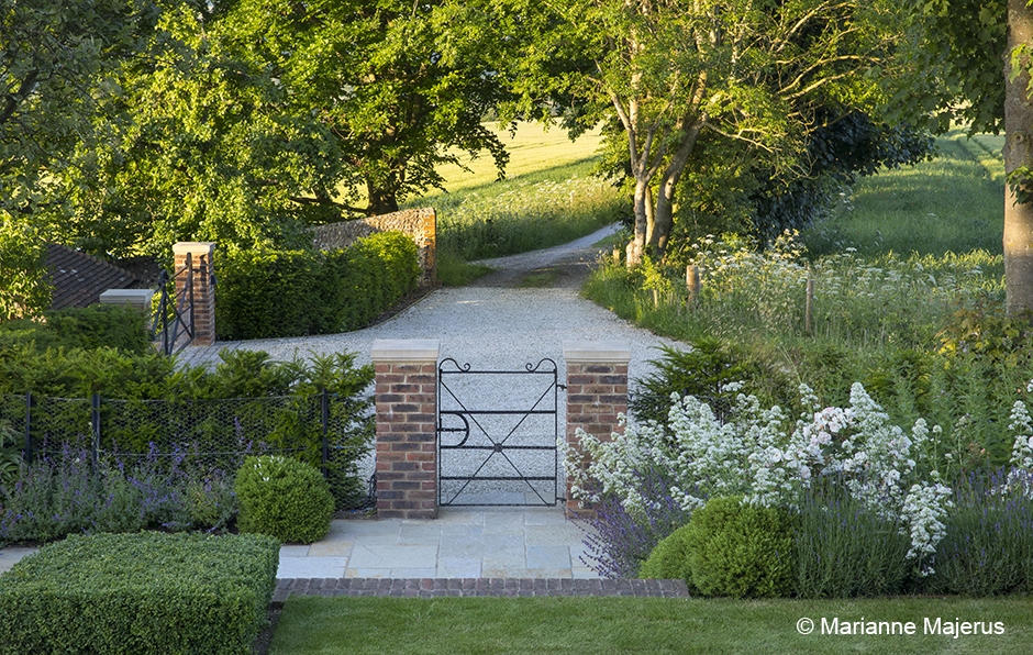 Metal gate, driveway, stone path, yew hedge, Centranthus ruber ‘Albus’, Lavandula angustifolia ‘Hidcote’