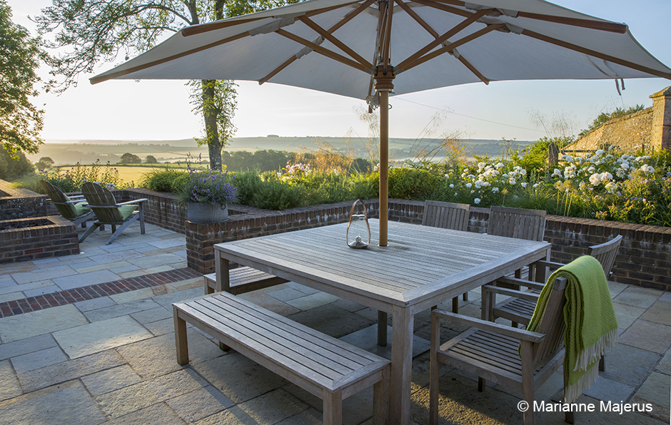 Wooden chairs, table and benches under umbrella on stone patio, blanket, brick walls, Rosa ‘Iceberg’, Stipa gigantea
