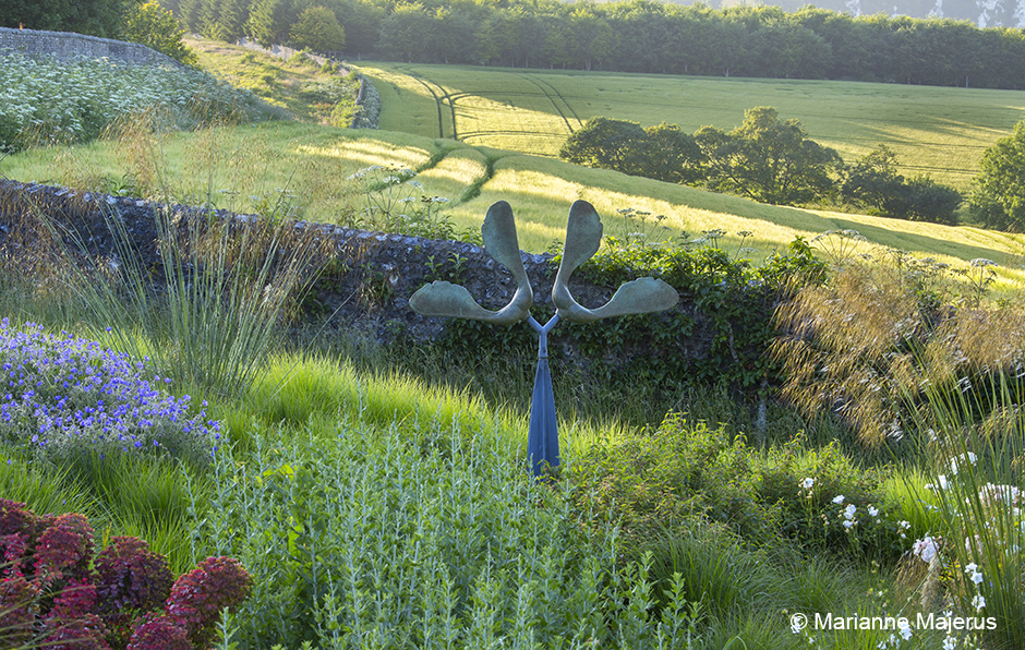 Sycamore seedhead sculpture by David Watkinson, Stipa gigantea, Perovskia ‘Blue Spire’, Geranium ‘Brookside’, Euphorbia x martinii, Sesleria autumnalis