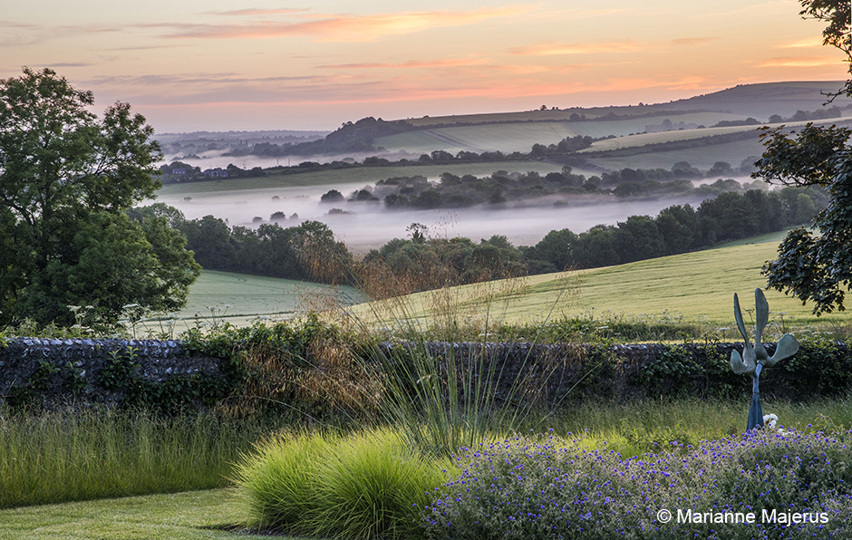 Stipa gigantea, Sesleria autumnalis, Geranium ‘Brookside’, view towards mist in valley, sculpture by David Watkinson
